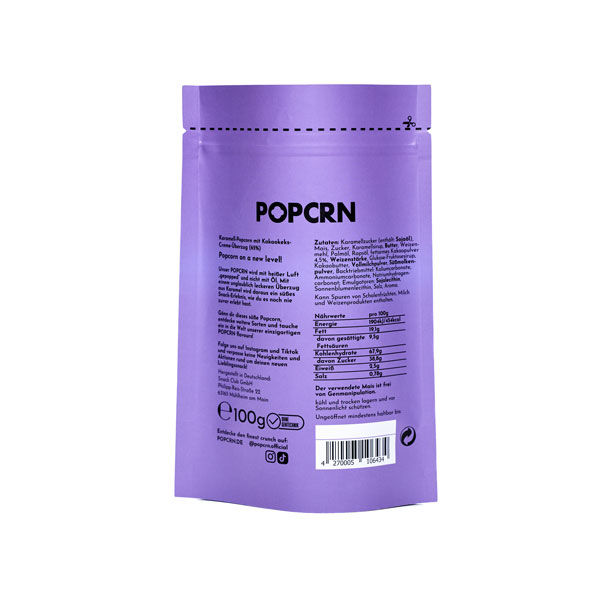Karamell Popcorn mit Kakaokeks-Creme-Überzug (65%).